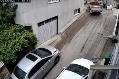 Kaza yaptığını fark ettikten sonra patinaj yaparak yokuştan çıkan sürücü, kaçarak kayıplara karıştı. O anlar saniye saniye güvenlik kamerasına yansıdı.