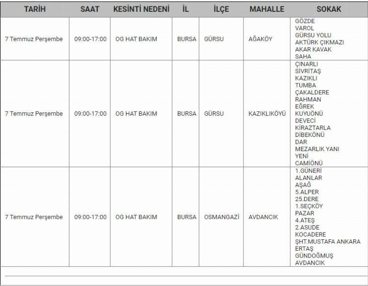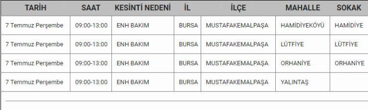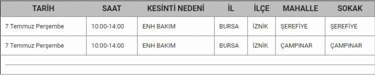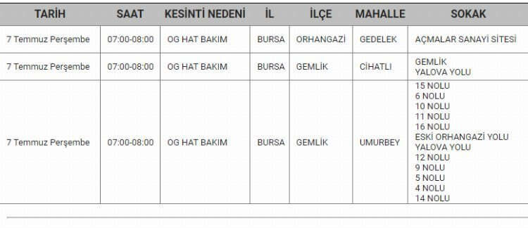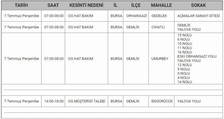 Bursa'da 7 Temmuz tarihinde elektrik kesintisi yapılacak.