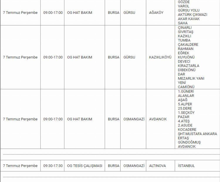 Bursa'da 7 Temmuz tarihinde birçok ilçe ve mahallede elektrik kesintileri olacak. Dağıtım şirketi tarafından yapılan açıklamada kesintilerin mağduriyet yaşatmaması için tedbirli olunması istendi.