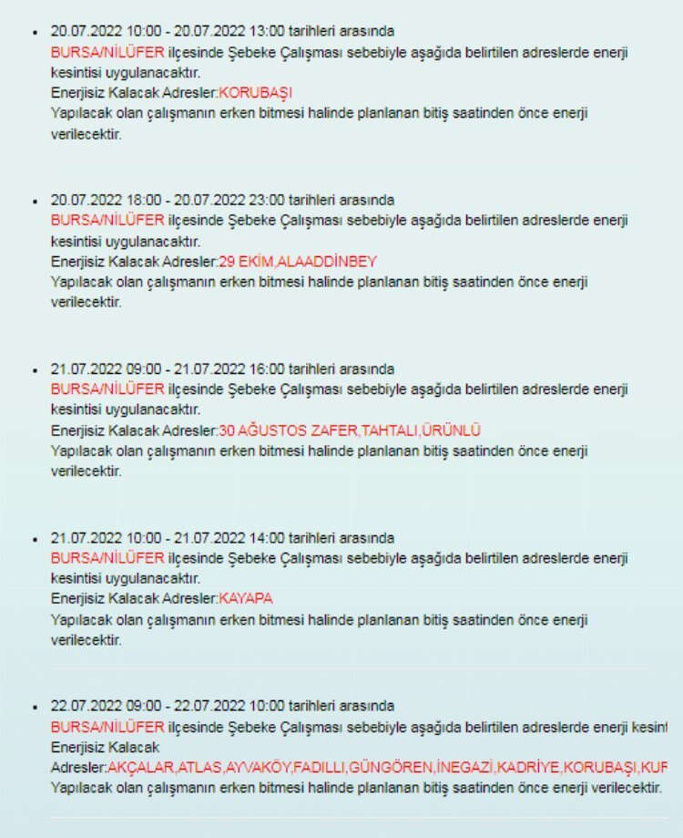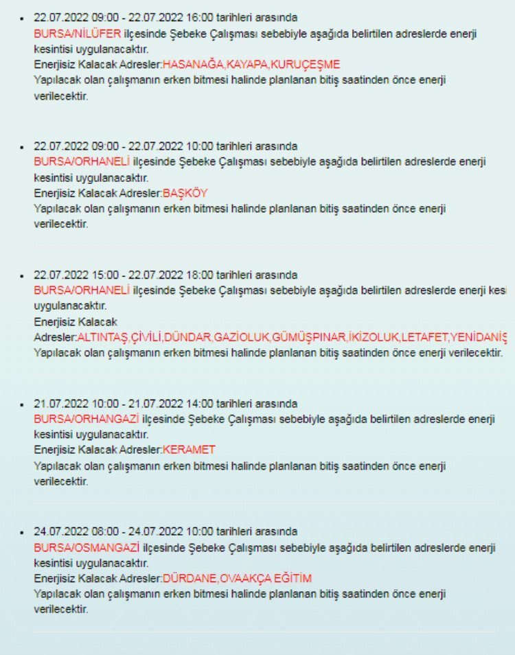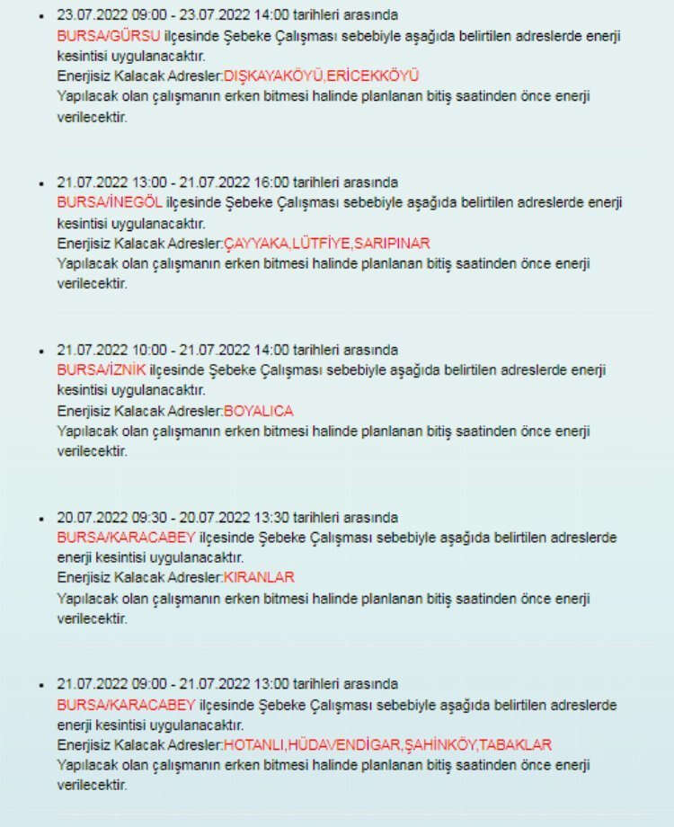 Bugünden itibaren başlayarak 21-22-23 ve 24 Temmuz tarihlerinde Bursa'nın çeşitli ilçelerinde farklı sürelerde elektrik kesintileri yaşanacak.