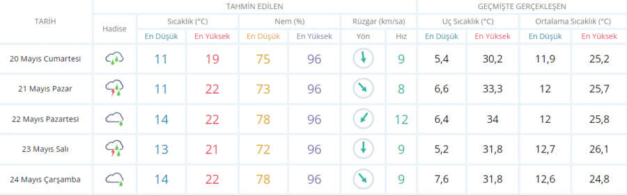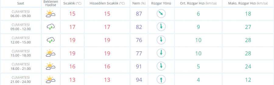 Bugün ülke genelinin parçalı ve çok bulutlu, Marmara, Kuzey ve İç Ege, Akdeniz, İç Anadolu, Karadeniz (Gümüşhane ve Bayburt hariç), Doğu Anadolu'nun doğusu ile Siirt çevrelerinin sağanak ve gök gürültülü sağanak yağışlı geçeceği tahmin ediliyor. Yağışların: Batı ve Orta Karadeniz'in iç kesimleri, Ankara, Konya, Aksaray, Nevşehir, Niğde, Yozgat, Çankırı, Hakkari çevreleri ile Antalya'nın iç, Isparta, Burdur ve Van'ın güney kesimlerinde yerel olarak kuvvetli olması bekleniyor. Doğu Anadolu'nun güneydoğusunda toz taşınımı görüleceği tahmin ediliyor.