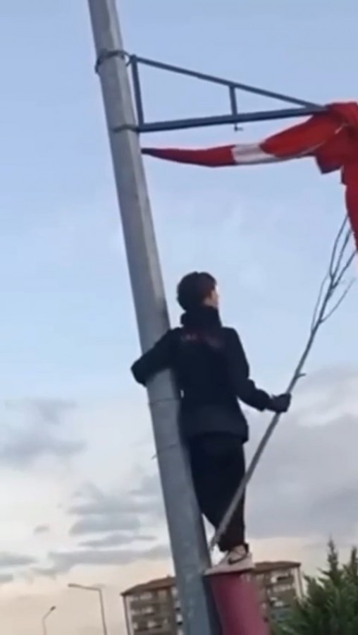 Bayrağa zarar gelmemesi için temkinli davranan çocuklar, sırayla direğe tırmanarak bayrağı açmaya çalıştı.