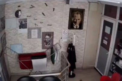 Deprem anı bir berber dükkanının güvenlik kamerası tarafından kaydedildi.