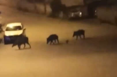 Bursa'da aç kalan domuz ailesi şehir merkezine inerek yemek aradı.
