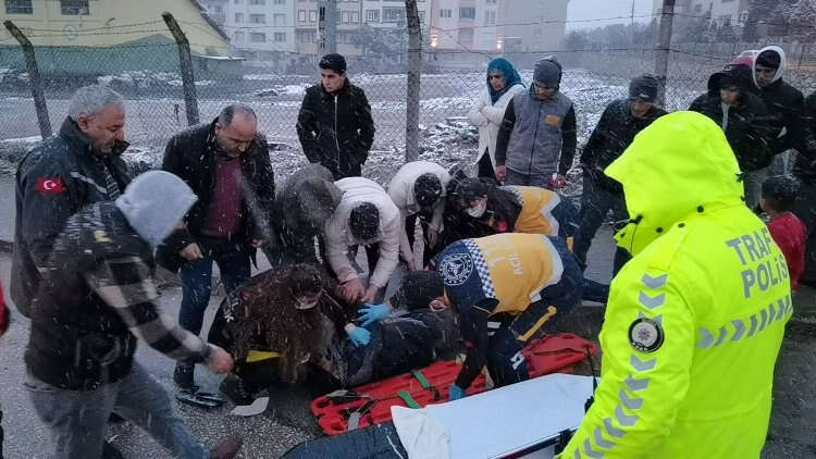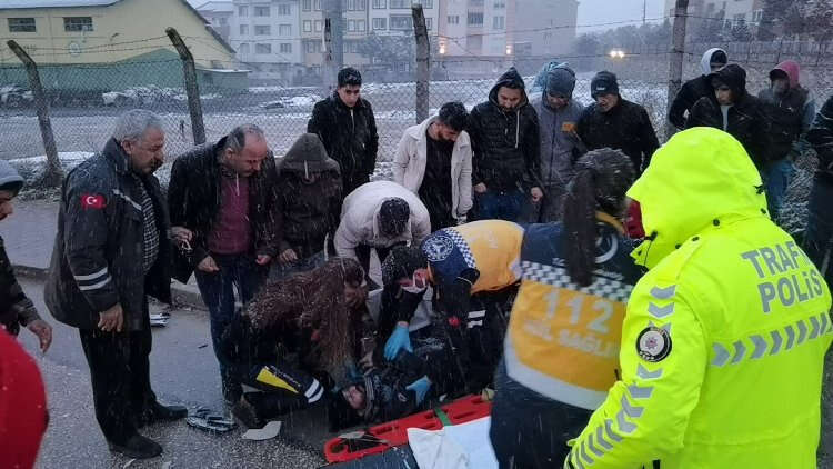 Bursa'nın İnegöl ilçesinde otomobil ile çarpışan elektrikli bisikletin sürücüsü yaralandı. Vatandaşlar kar yağışından korumak için yaralının üzerini kartonla örttü.
