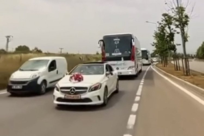 Bursa'da düğün aracı olarak yolcu otobüsünü tercih eden damat ve gelinin yakınları trafikte dikkat çekerken, konvoyda yer alan diğer otomobil sürücüleri ise trafikte tehlikeli hareketler yaparak hem kendilerini hem de diğer sürücüleri riske attı.