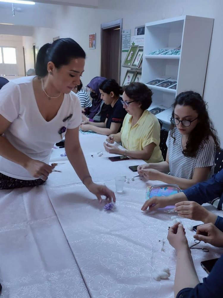 Elif Kamacı Efe’nin eğitmenliğini yaptığı workshopta ilk olarak telleme, toplama, tohumlama gibi teknik konular anlatılırken, daha sonra ipek kozalar kursiyerlerin elinde renklendi. El becerileri gelişen toplam 55 katılımcı, çalışma sonunda ipek kozadan bahar dalı çiçekli yaka broşu elde etti.
