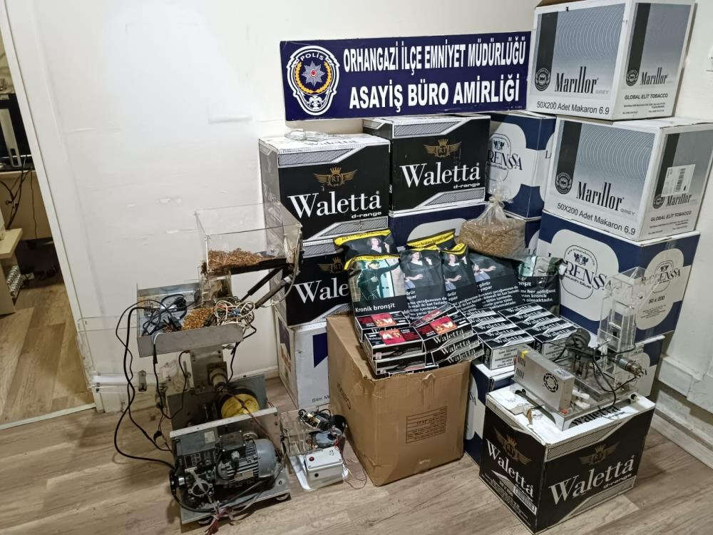 Orhangazi İlçe Emniyet Müdürlüğü Asayiş Büro Amirliği ekipleri, ihbar üzerine tütün kaçakçılığının önlenmesi ve suça karışan kişinin yakalanması amacıyla çalışma başlattı. Polis ekiplerince adım adım takip edilen B.D.’nin (50) tütün sakladığı öğrenildi. Cumhuriyet Savcısının talimatı ile B.D.’nin kiraladığı depoya operasyon yapan Orhangazi polisi, 1 adet büyük sigara doldurma makinesi, 1 adet küçük sigara doldurma makinesi, 19 adet ağzı açılmış 1 kilogramlık kıyılmış tütün, 50 adet 200’lük doldurulmuş makaron kutu, 622 adet 200’lük boş makaron kutu, 100 adet içerisi boşaltılmış tütün paketi ve 150 adet TABDK bandrolü ele geçirdi. Polis ekiplerince depodaki malzemelere el koyulurken, şüpheli şahıs ise ifadesi alınmak üzere gözaltına alındı.