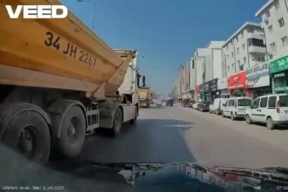 Olay, merkez Osmangazi ilçesi Ankara Yolu Caddesi'nde meydana geldi. Akan trafikte seyir halinde olan otomobilin önüne bir anda 34 JH plakalı kamyon atladı. Otomobil sürücüsü, manevra ile kazayı önlerken tehlikeli anlar saniye saniye araç içi kamerasına yansıdı.