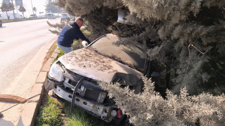 Alanyurt'tan İnegöl'e seyir halinde olan Aziz D.(57) yönetimindeki 16 ACK 76 plakalı otomobil, iddiaya göre başka bir aracın sıkıştırması sonucu sürücüsünün kontrolünden çıktı. Yoldan çıkan araç alışveriş merkezi bahçesindeki ağaçlara çarparak durabildi.