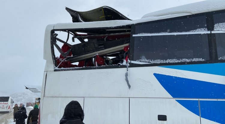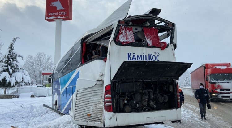 Bursa’nın İnegöl ilçesi Bursa-Ankara karayolu üzeri mezit boğazında meydana gelen kazada kontrolden çıkan Kamil Koç turizme ait şehirlerarası yolcu otobüsü kar nedeniyle kayarak tıra çarptı, 2 yolcu yaralandı.