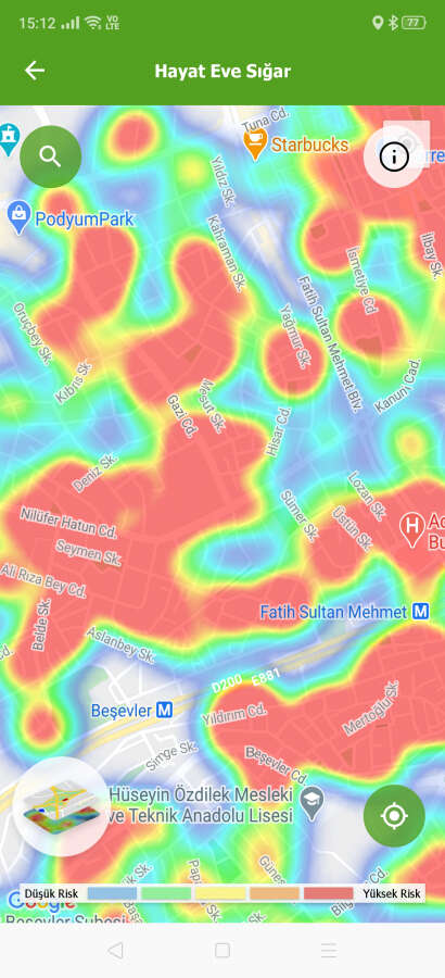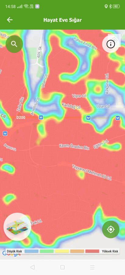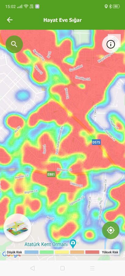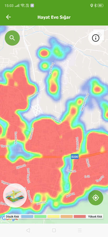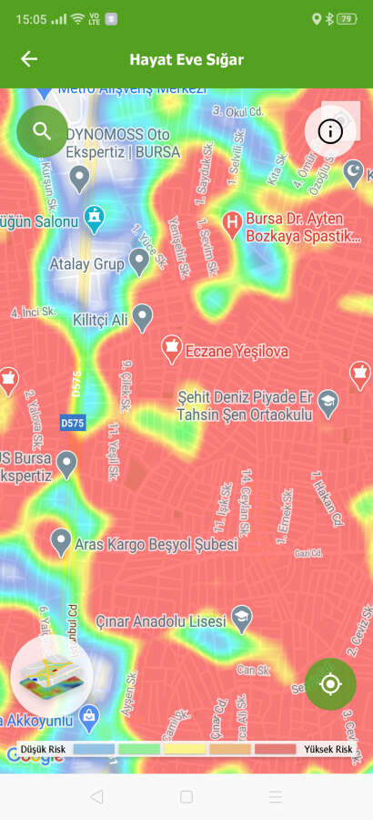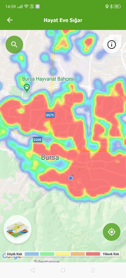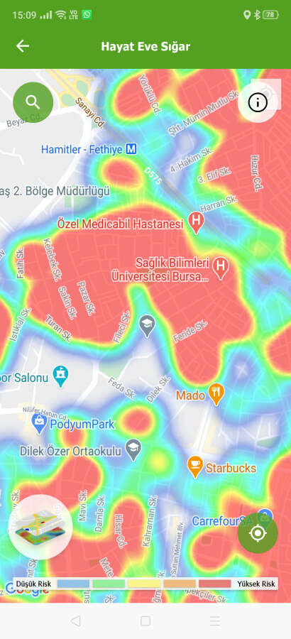 Bir önceki güncellemede Bursa'nın bazı ilçelerinde risk yok denecek kadar azken, yeni güncellemeyle birlikte yoğunluk haritasında kırmızı(yüksek riskli) olmayan alan yok denecek kadar az...