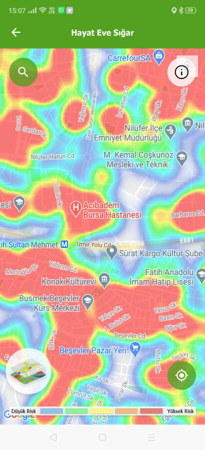 'Hayat Eve Sığar' uygulamasının Bursa için yeni güncellenen risk haritasına göre kırmızı ile gösterilen (yüksek riskli) bölgeler yayılarak artıyor.