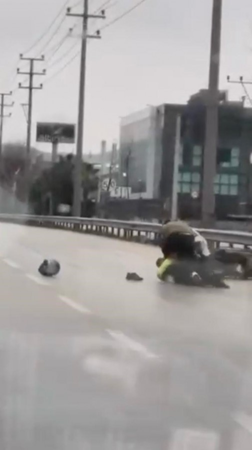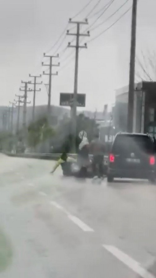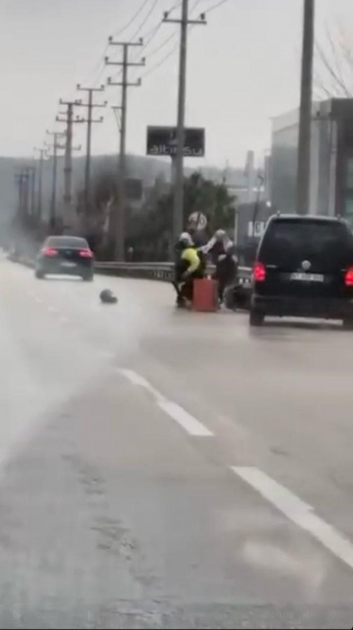 Bursa'nın Kestel ilçesinde seyir halindeki sürücü ile kurye arasında çıkan kavgada tekme ve yumruklar havada uçuştu. Araçtan inen sürücü, motokuryeyi darp ederken, kadınlar olayı ayırmak için var gücüyle çabaladı. Araçtan inen bir çocuk ise o anları şaşkınlıkla izledi.