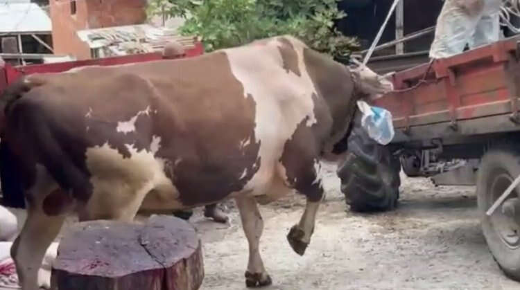 Bursa'da öfkelenen kurbanlık boğayı köylüler zor zapt etti. Öfkeli boğa sonunda pes ederek kesildi.