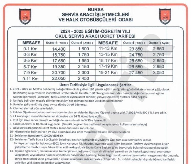 Bursa'da 2024-2025 eğitim öğretim yılı servis ücretlerine, yüzde 46 aralığında zam yapıldı.