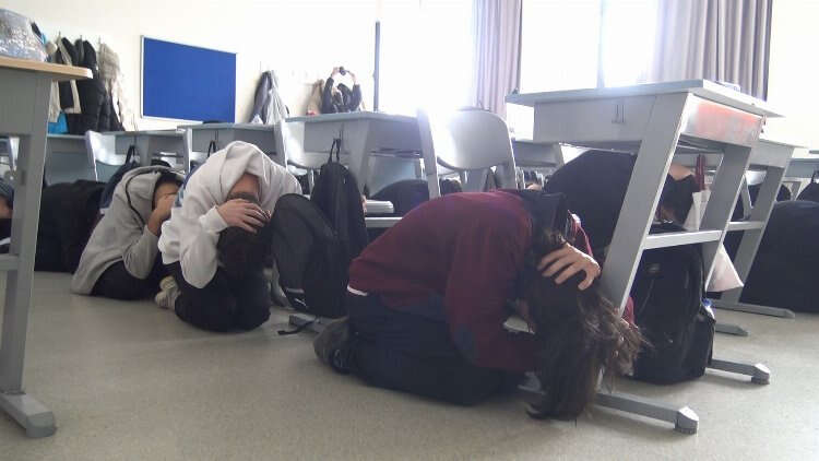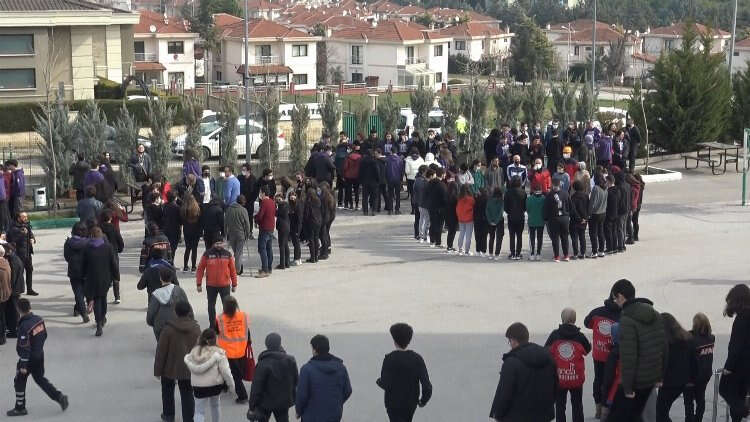 Ders esnasında sirenlerin çalması ile birlikte öğrenciler sıraların sağ tarafına başlarını koruyacak şekilde eğildiler. Ardından uygun zamanda sınıfları duvar kenarından hızlı adımlarla boşaltan öğrenciler okul bahçesinde toplandı. Kümeler oluşturan öğrencilerin sayımları öğretmenleri tarafından yapıldı.