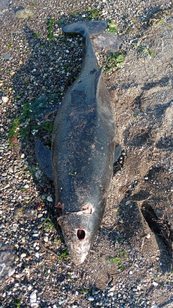 Gemlik ilçesi Gemsaz sahiline boğaz kısmı parçalanmış yunus balığı vurdu.