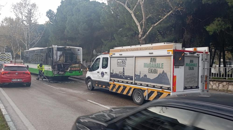 Bursa'da şehir içi yolcu otobüsünün motor kısmında başlayan yangın, yolcular arasında büyük paniğe sebep oldu.