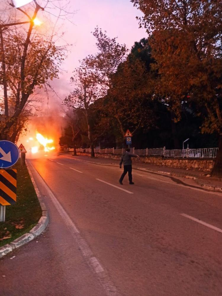 Motor kısmından çıkan yangını fark eden şoför, hızlı bir şekilde otobüsteki yolcuları tahliye etti.