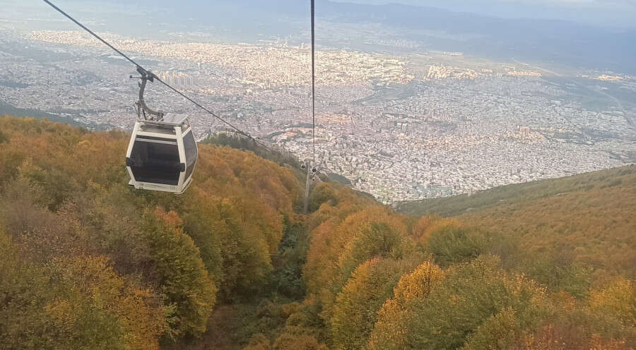 Dünyanın tek halatlı en uzun hatlarından birine sahip olan ve Bursa'dan Uludağ'a alternatif ulaşım sağlayan teleferikle yolculuk, sonbaharda yolcularına renk cümbüşü sunuyor.
