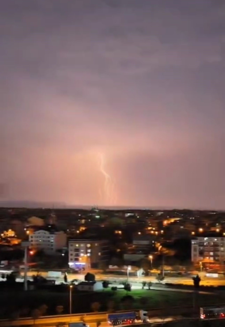 Bursa'nın Karacabey ilçesinde akşam saatlerinde art arda çakan şimşekler geceyi adeta gündüze çevirdi.