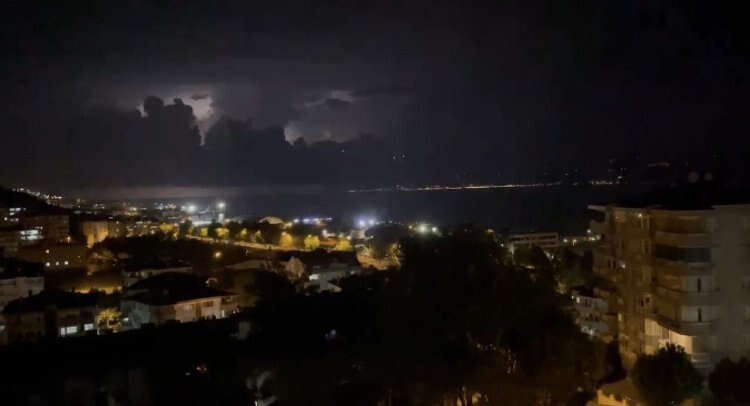 Mudanya ilçesinde gece saatlerinde etkili olan yağmurla birlikte çakan şimşekler geceyi gündüze çevirdi.