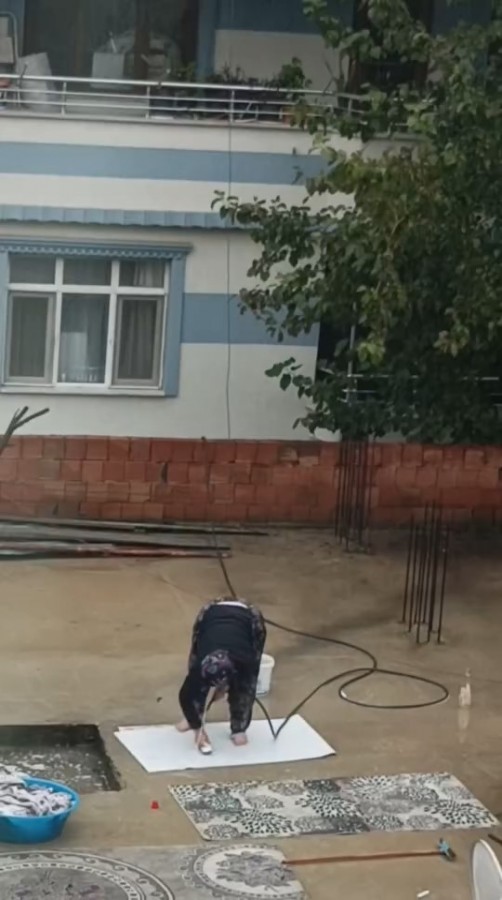 Belediyenin uyarısı ve kesintilere rağmen bir kadın apartman çatısında halı yıkarken görüntülendi.