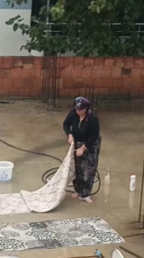 Bursa'da su kesintisi yapılırken, yağmur altında hortumla halı yıkayan bir kadın tepkiye sebep oldu. O anlar çevredekilerin cep telefonu kameralarına saniye saniye kaydedildi.