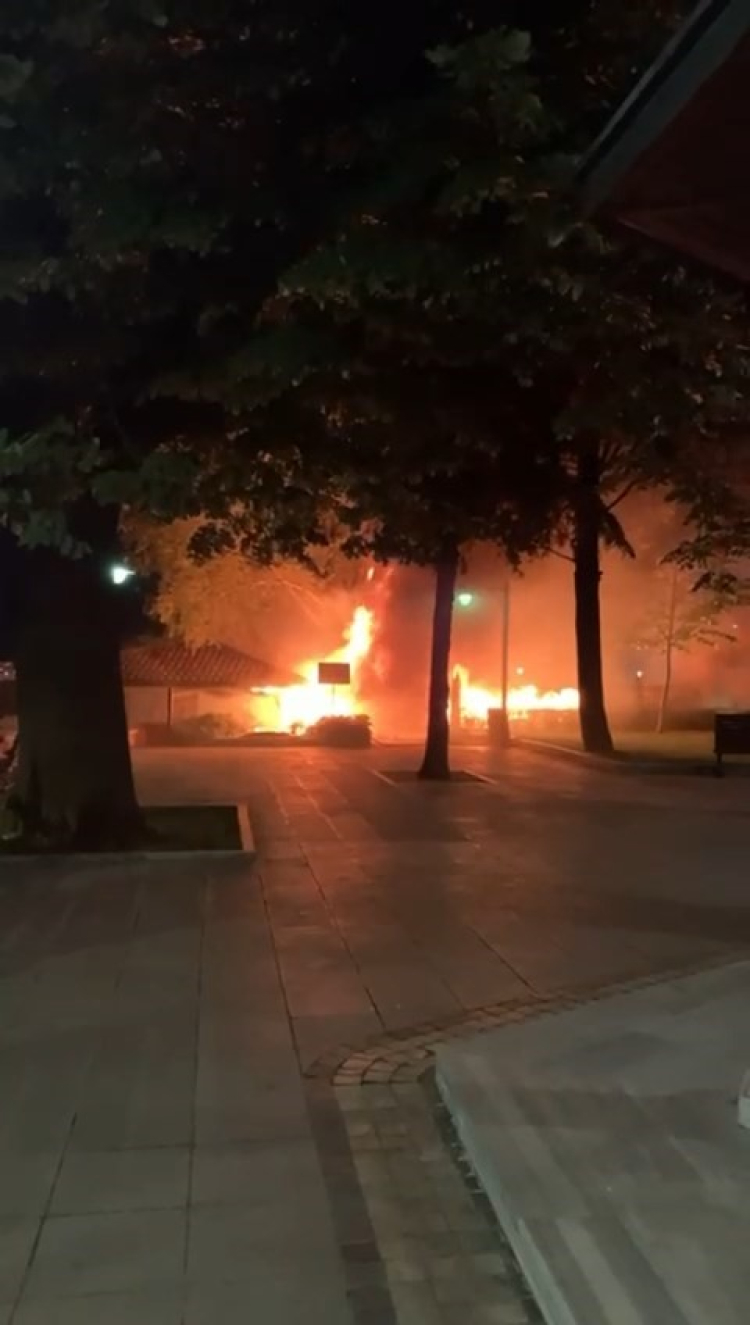 Bursa'nın tarihi Çekirge Semti'ndeki I.Murat Hüdavendigar Camisi'nin bahçesindeki çay bahçesi, gece çıkan yangında küle döndü. İtfaiye ekipleri yangını söndürdü, olayla ilgili soruşturma sürüyor. Çalışanlar yanan malzemeleri topladı.