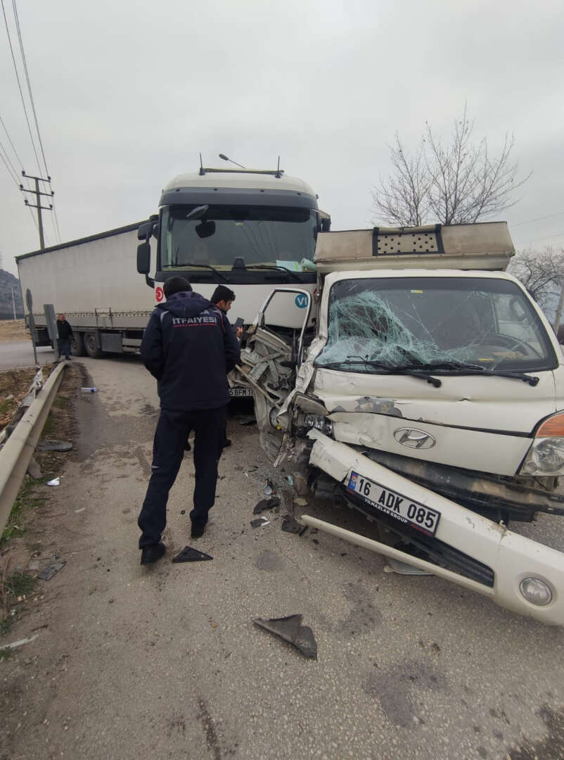 Bursa'da TIR ile kamyonetin çarpışması sonucu 1 kişi sıkışarak yaralandı.