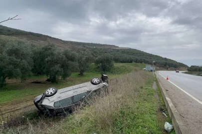 Yağmur sebebiyle yerlerin de kayganlığıyla direksiyon hakimiyetini kaybeden sürücü, otomobiliyle birlikte tarlaya uçtu. Ters dönen araçtan şoför ve yanındaki kişi yaralı olarak kurtuldu.