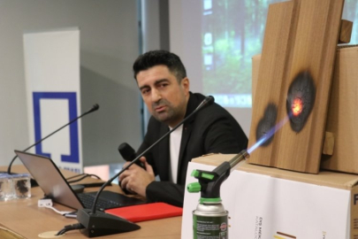 Mimarlar Odası Konferans Salonu'nda düzenlenen seminerde ahşap konusunda detaylı bir sunum gerçekleştiren Mustafa İlhan, konuşmasının başında FireFence cinsi yanmaz ahşabı, yanan bir pürmüzün karşısına koyarak sunumuna devam etti.