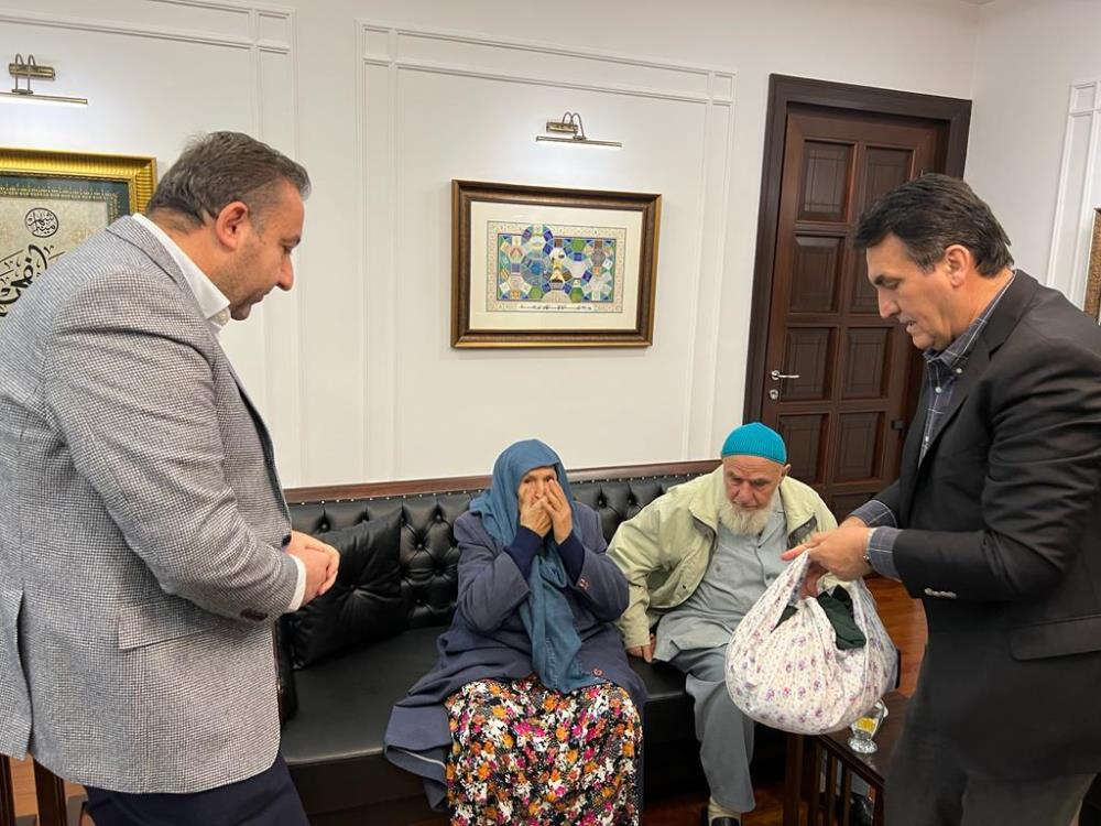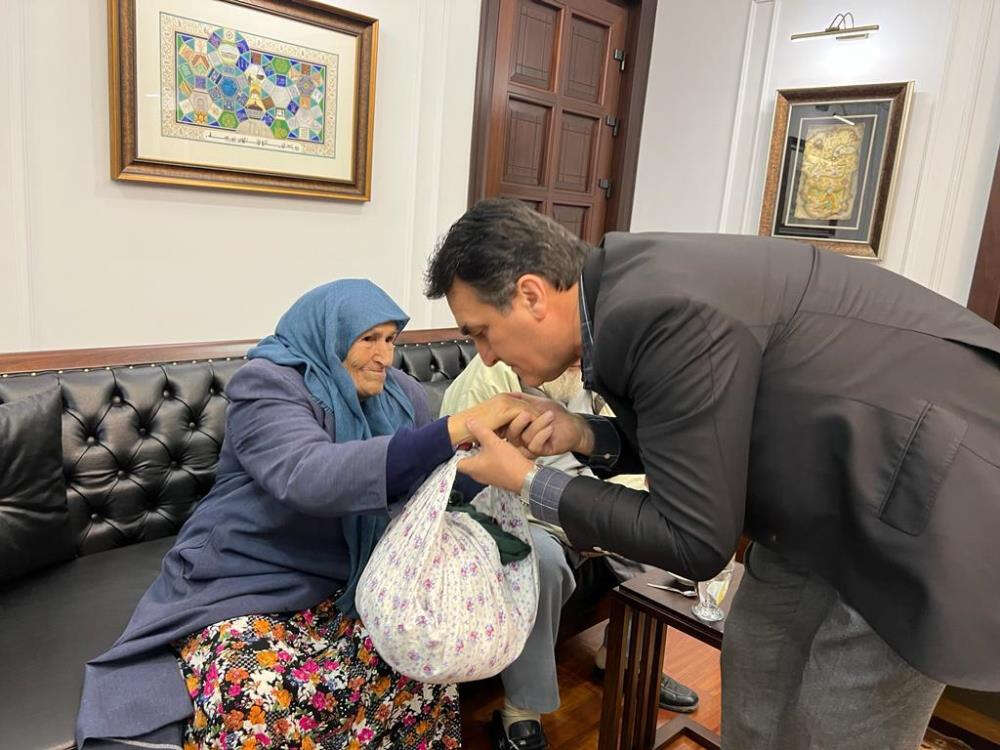 Yeniceabat Mahallesi’nde yaşayan 96 yaşındaki Ali Günay ile 92 yaşındaki eşi Fadime Günay, Türkiye’yi yasa boğan büyük afetin ardından deprem bölgesine yardım yapma arzularını Osmangazi Belediye Başkanı Mustafa Dündar’a iletti. Başkan Dündar yaşlı çifti AK Parti Osmangazi İlçe Başkanı Ufuk Cömez ile birlikte makamında ağırladı. Günay çifti hazırladıkları biner lira para ile içinde kendi elleriyle ördükleri kışlık kıyafetlerin olduğu bohçayı Başkan Dündar’a teslim etti.