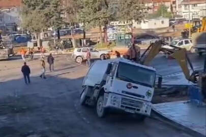 İnegöl Belediyesi ekipleri tarafından Cuma Mahallesi Hastane Caddesi'nde asfalt çalışması yapılan yoldan geçen temizlik kamyonu, çöken alana düştü.