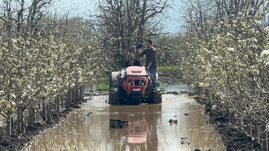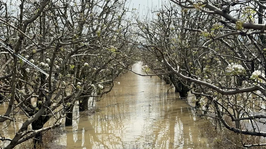 Bursa'nın Gürsu ilçesinde yüzlerce dönüm şeftali ve armut bahçesi su altında kalırken, çiftçiler kritik zaman olarak gördükleri çiçeklenme döneminde zararlılara karşı mücadeleyi çamur içinde yürütüyor.