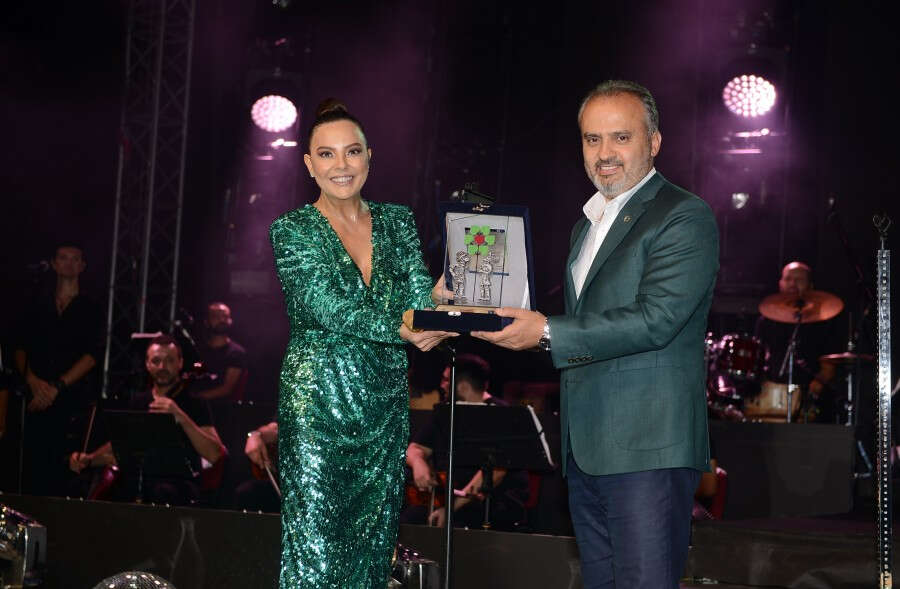 Bursa Büyükşehir Belediye Başkanı Alinur Aktaş, ünlü sanatçıya teşekkür ederek, BKSTV logolu Hacivat - Karagöz plaketi sundu.