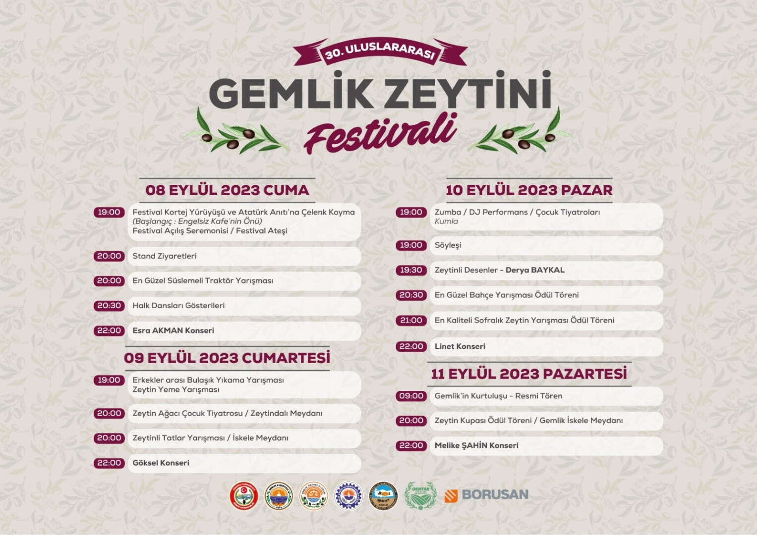 Gemlik Belediyesi tarafından düzenlenen, Gemlik Kaymakamlığı, Gemlik Ticaret Borsası, Gemlik Esnaf ve Sanatkârlar Odası, Gemlik Esnaf Kefalet Kooperatifi, Gemtar’ın katkılarıyla ve Borusan’ın sponsorluk desteği verdiği 30. Gemlik Zeytin Festivali; 8 – 11 Eylül tarihleri arasında Gemlik İskele Meydanı’nda düzenlenecek.