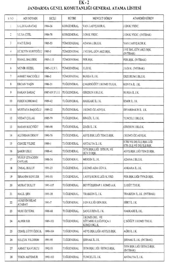Buna göre, Korgeneral Salih Karataş ile Korgeneral Musa Çitil Jandarma Genel Komutanı Yardımcılığına, Tümgeneral Hacı İlbaş Van Jandarma Asayiş Kor. Komutanlığına, Tümgeneral Hüseyin Kurtoğlu Jandarma ve Sahil Güvenlik Akademisi Başkanlığına, Tümgeneral İsmail Balıbek Personel Başkanlığına, Tümgeneral Münir Güzel Janarma Lojistik Komutanlığına, Tümgeneral Ahmet Hacıoğlu Erzurum Jandarma Bölge Komutanlığına, Tuğgeneral Ercan Yaşin Konya İl Jandarma Komutanlığına, Tuğgeneral Hakan Saraç Bursa İl Jandarma Komutanlığına, Tuğgeneral Ferdi Korkmaz İzmir İl Jandarma Komutanlığına, Tuğgeneral Mustafa Başoğlu Diyarbakır İl Jandarma Komutanlığına, Tuğgeneral Vedat Çolak Tunceli Jandarma Bölge Komutanlığına, Tuğgeneral Hasan Koçyiğit Giresun Jandarma Bölge Komutanlığına, Tuğgeneral Ali İhsan Ersoy Jandarma Komando Özel Asayiş Komutanlığına, Tuğgeneral Cengiz Yıldız Strateji ve Dış İlişkiler Başkanlığı Strateji Geliştirme ve Dış İlişkiler Başkanlığına, Tuğgeneral Şakir Uslu Asayiş Başkanlığı Tem. Dairesi Başkanlığına, Tuğgeneral Yusuf Ziyaaddin Cavlak Adana Jandarma Bölge Komutanlığına, Tuğgeneral Ünsal Bulut Ankara İl Jandarma Komutanlığına, Tuğgeneral İbrahim Koyuer Personel Başkanlığı/Tyn. Dairesi Başkanlığına, Tuğgeneral Murat Bulut 2. Jandarma Eğitim Tugay Komutanlığına, Tuğgeneral Halil Şen Trabzon İl Jandarma Komutanlığına, Tuğgeneral Hüseyin Hilmi Atabay Siirt İl Jandarma Komutanlığına, Tuğgeneral Nuri Öztürk Hakkari İl Jandarma Komutanlığına, Tuğgeneral Alper Sır Ç. Söğüt Jandarma Komando Tugay Komutanlığına, Tuğgeneral Cemil Lütfi Özkul Ağrı İl Jandarma Komutanlığına, Tuğgeneral Selçuk Yıldırım Şırnak İl Jandarma Komutanlığına, Tuğgeneral Ahmet Kavukcu İstihbarat Dairesi Başkanlığına ve Tuğgeneral Tekin Aktemur Antalya İl Jandarma Komutanlığına atandı.