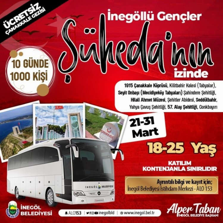 İnegöl Belediyesi, 18 Mart Çanakkale Zaferi ve Şehitleri Anma Günü kapsamında 10 gün sürecek bir gezi programı düzenledi. 18-25 yaş arası bin genç Çanakkale’ye götürülecek. Kahvaltı ve öğle yemeği ikramlarını belediyenin üstleneceği organizasyon için kayıtlar 21 Mart Pazartesi gününe kadar belediye binasında alınacak. İlk kafile ise 20 Mart Pazar gecesi yola çıkacak.