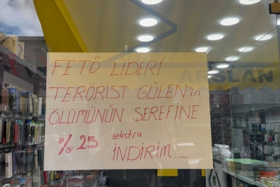 Esnaf Semih Arslan, FETÖ terör örgütü lideri Fethullah Gülen'in ölümü nedeniyle iş yerinde yüzde 25 indirim kampanyası başlattı.
