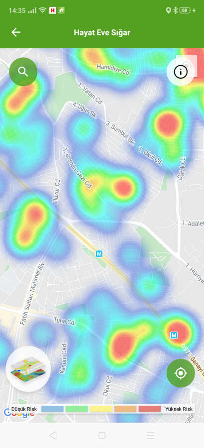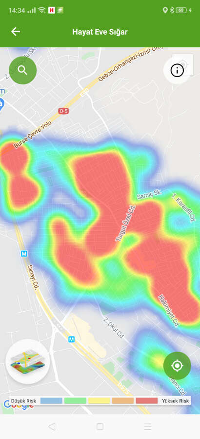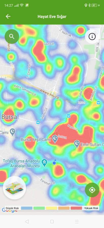'Hayat Eve Sığar' uygulamasıyla ilçe ilçe koronavirüs yoğunluk haritasına erişilebiliyor. Uygulamaya göre kırmızı alanlar yüksek riskli alanları gösterirken, mavi alanlar ise düşük riskli bölgeleri temsil ediyor. İşte Bursa'nın ilçe ilçe mahalle mahalle Temmuz ayı itibariyle güncellenen koronavirüs youğunluk haritası...