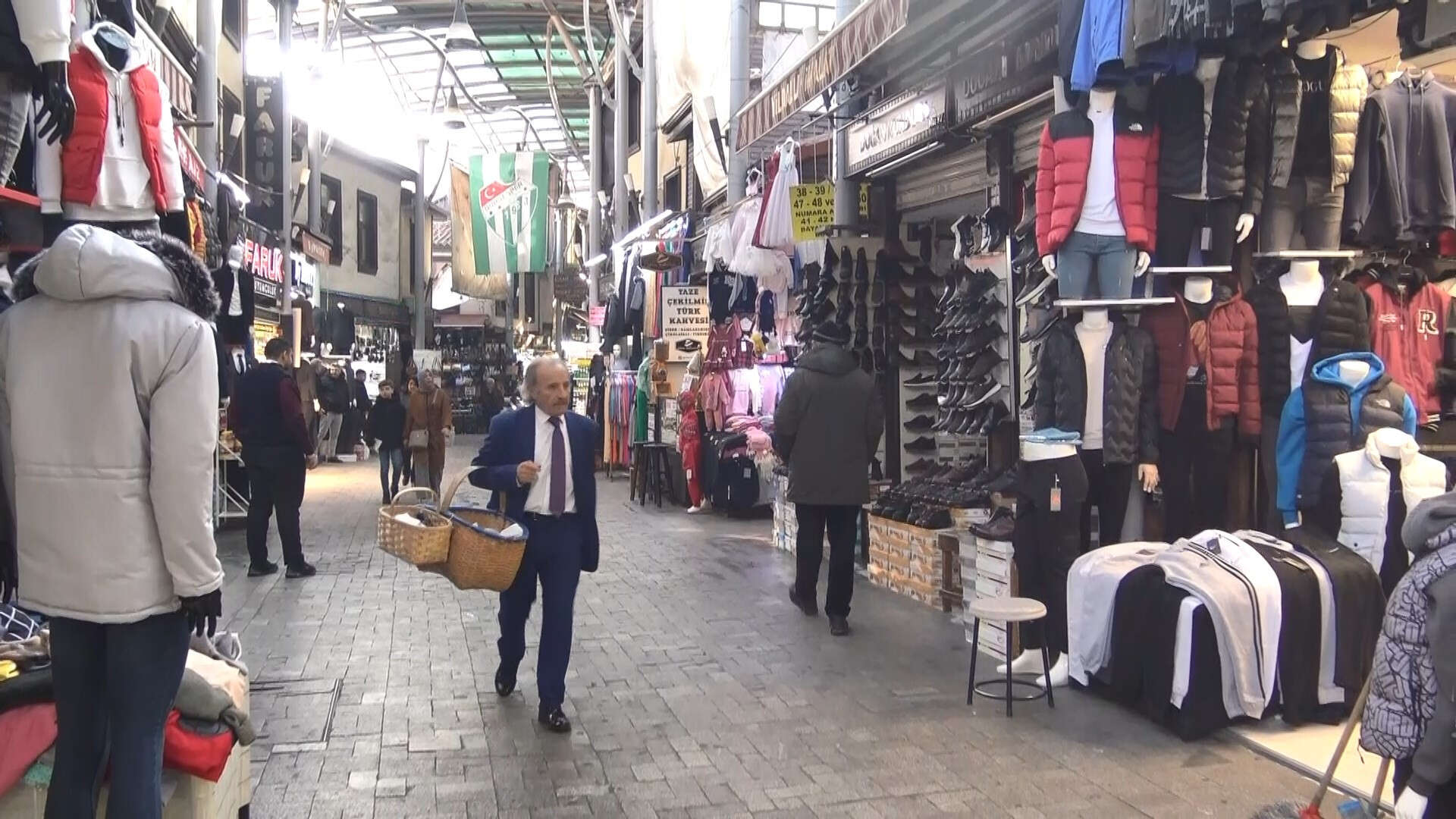 Bursa'da memur emeklisi Ahmet Berksun, soğuk havaya aldırış etmeden takım elbise giyerek koluna taktığı sepetle tarihi çarşıda simit satıyor.