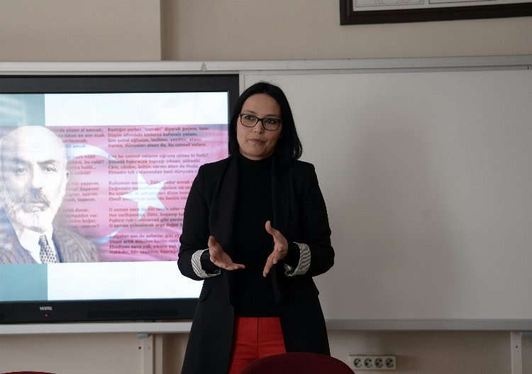 Bursa Anadolu Lisesi’nde gerçekleşen söyleşide Doç. Dr. Hacer Karabağ, 12 Mart 1921’de Türkiye Büyük Millet Meclisi tarafından kabul edilen İstiklal Marşı hakkında öğrencilere bilgiler verdi.