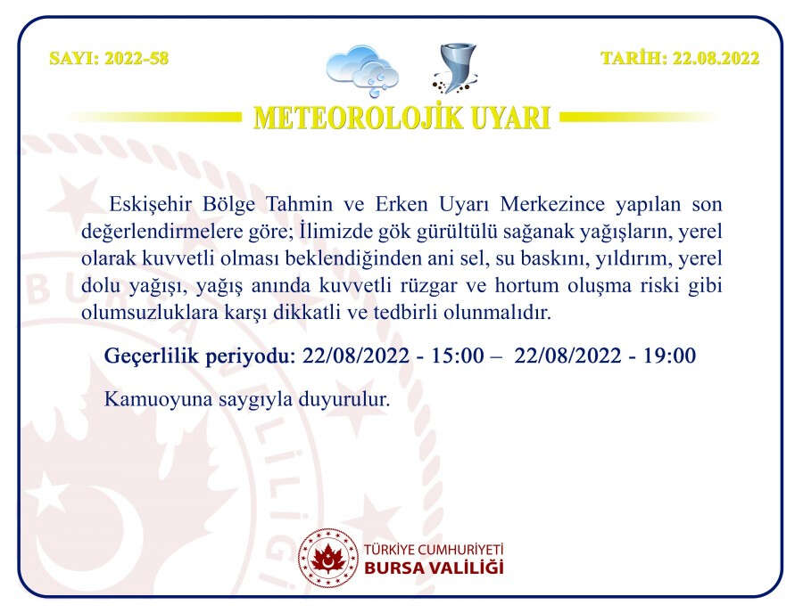Eskişehir Bölge Tahmin ve Erken Uyarı Merkezince yapılan son değerlendirmelere göre; İlimizde gök gürültülü sağanak yağışların, yerel olarak kuvvetli olması beklendiğinden ani sel, su baskını, yıldırım, yerel dolu yağışı, yağış anında kuvvetli rüzgar ve hortum oluşma riski gibi olumsuzluklara karşı dikkatli ve tedbirli olunmalıdır.