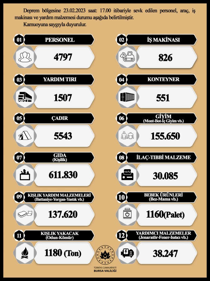 Valilikten yapılan açıklamada; "Deprem bölgesine 23.02.2023 satt 17.00 itibariyle sevk edilen personel, araç, iş makinası ve yardım malzemesi durumu belirtilmiştir" ifadelerinde bulunuldu.
