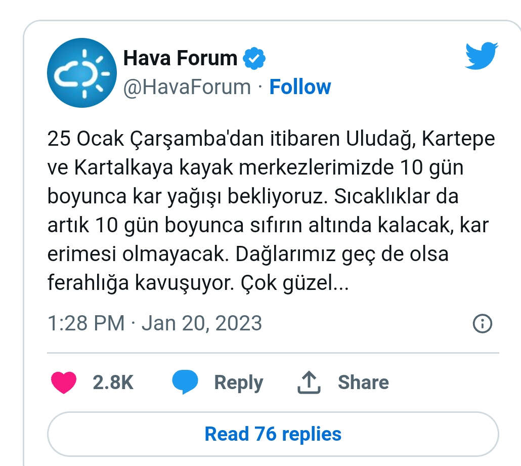 Hava Forum, 10 gün boyunca Bursa Uludağ'da yoğun kar yağışı beklendiğini açıkladı.