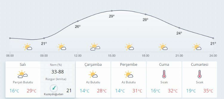 19 Temmuz Salı günü Bursa'da şehir genelinde sabah saatlerinden itibaren etkili olan güneşli havayla birlikte termometreler gün içerisinde 29 dereceye kadar tırmanacak.
