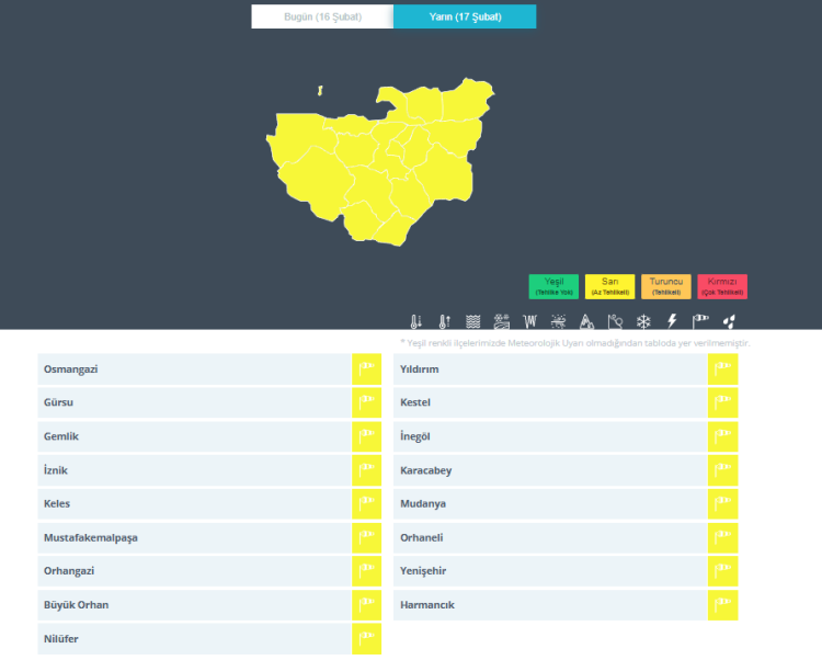 Meteoroloji Genel Müdürlüğü (MGM), Bursa'nın 17 ilçesini de "sarı" kodla kuvvetli fırtınaya karşı uyardı.