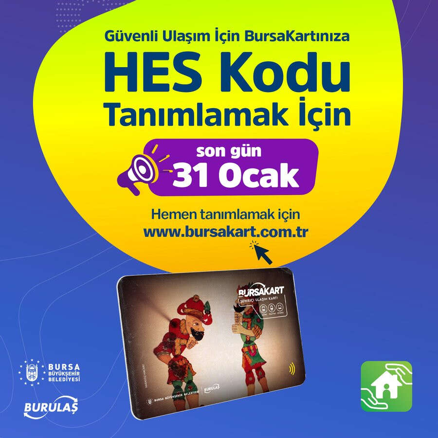 Bursa'nın ulaşım kartı BursaKart'ı kullananlar için de uyarı geldi. BursaKart'lar için HES kodu tanımla işleminin yapılması için belirlenen son tarih 31 Ocak 2021.
